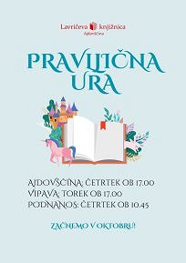 Vabimo vas, da svoje otroke pripeljete na pravljične ure v Lavričevo knjižnico. Za približno eno šolsko uro bodo otroci postali del domišljijskega sveta, se družili s pravljičnimi junaki in ustvarjali zanimive izdelke. Ob prvem obisku otroci prejmejo dnevnik pravljic, v katerega skozi vse leto zbirajo žige. Ob zaključku pravljičnega leta redne poslušalce in zbiralce žigov čaka presenečenje.