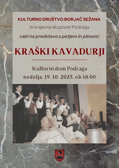 Kulturno društvo Borjač Sežana v sodelovanju s Krajevno skupnostjo Podraga vabi na predstavo s petjem in plesom KRAŠKI KAVADURJI, ki bo v nedeljo 19.10.2025 ob 18.00 v Kulturnem domu Podraga.