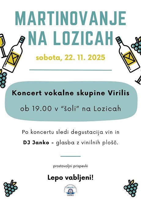 Vabljeni na martinovanje na Lozicah, ki bo v soboto, 22.11.2025 ob 19.00 v "šoli" na Lozicah. Prisluhnili boste koncertu vokalne skupine Virilis. Po koncertu sledi degustacija vin in DJ Janko.