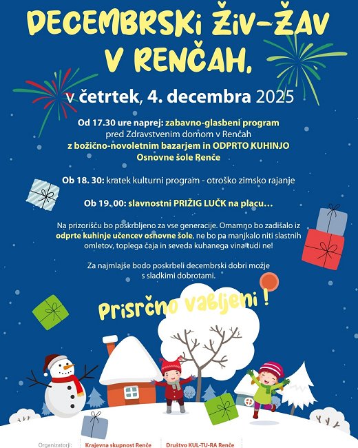Čaka vas zabavni program, bazar, odprta kuhinja, otroško rajanje in prižig lučk! Dogodek organizirajo KS Renče, OŠ Lucijana Bratkoviča Bratuša, KO RK Renče, Društvo KUL-TU-RA in DU Renče.