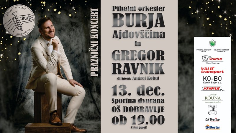 Naj vas v prazničnem času tudi letos ogrejejo tople melodije Pihalnega orkestra Burja Ajdovščina. V športni dvorani OŠ Dobravlje bo v soboto, 13. decembra ob 19. uri še posebej čarobno. Orkestru se bo tokrat na odru pridružil eden najbolj cenjenih tenoristov in pop pevcev pri nas – Gregor Ravnik. Ob orkestrski spremljavi boste lahko prisluhnili eni od njegovih avtorskih skladb ter ostalim znanim slovenskim melodijam. Melodije pa bodo zazvenele tudi v duetu s še eno gostjo, ki za enkrat ostaja presenečenje.Da bo repertoar res pester, bo še dodatno poskrbel Pihalni orkester Burja z njihovim izborom samostojnih orkestrskih skladb. Kot solist na trobenti se bo predstavil obetavni član Tim Kobal. Prisrčno vabljeni, da se nam pridružite in z nami preživite čudovit praznično-glasbeni večer! Vstop prost!