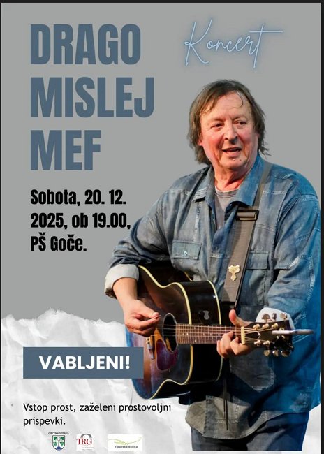 Nazaj na dogodke Ostalo Koncert: Drago Mislej Mef Osnovna šola Goče 20.12.2025 19:00 Krajevna skupnost Goče, ks.goce@vipava.si Vabljeni na koncert Draga Misleja Mefa, ki bo v soboto 20.12.2025 ob 19.00 v Podružnični šoli Goče.