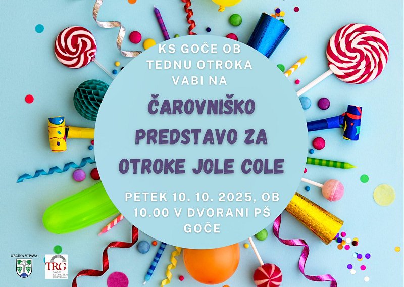 Nazaj na dogodke Prireditve za otroke ČAROVNIŠKA PREDSTAVA JOLE COLE Dvorana OŠ Goče 10.10.2025 10:00 Povezava do dogodka na Facebooku KS GOČE vabi ob tednu otroka na čarovniško predstavo za otroke JOLE COLE. Lepo vabljeni, da si predstavo ogledate 10. 10., ob 10.00 v dvorani OŠ Goče.