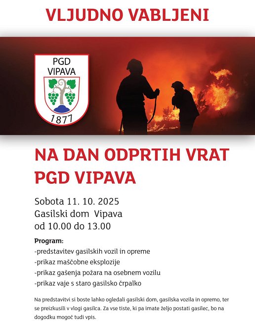 PGD Vipava vabi na Dan odprtih vrat v gasilskem domu Vipava, ki bo potekal v soboto, 11. oktobra 2025, od 10.00 do 13.00.