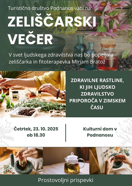 Turistično društvo Podnanos vabi na Predavanje zeliščarke in fitoterapevtke Mirjam Bratož: Zdravilne rastline, ki jih ljudsko zdravilstvo priporoča v zimskem času, ki bo v 23. 10. 2025 ob 18.30 v Kulturnem domu Podnanos.
