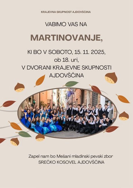 Nazaj na dogodke Zabava Martinovanje v Ajdovščini Dvorana krajevne skupnosti Ajdovščina 15.11.2025 18:00 Za popestritev pograma bo poskrbel Mešani mladinski pevski zbor Srečko Kosovel Ajdovščina.