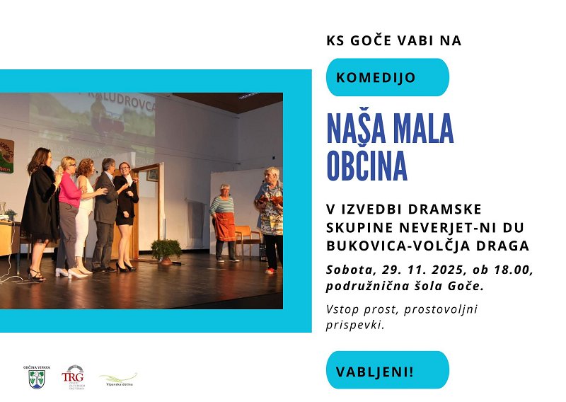 Krajevna skupnost Goče vabi na komedijo Naša mala Občina, v izvedbi dramske skupine Neverjet - NI DU Bukovica - Volčja Draga, ki bo v soboto 29.11.2025 ob 18.00 v POŠ Goče.