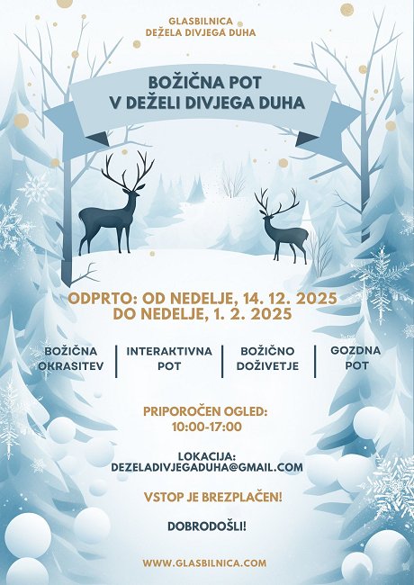 Vabljeni v Deželo divjega duha, kjer se bo skozi gozd razprla Božična pot – interaktivno doživetje, prepleteno z naravo, ustvarjalnostjo in božičnim mirom. Pot vas vodi skozi svet naravnih, zaprašenih in recikliranih materialov, glasbe, meditacije, igre in razmišljanja o vrednotah. Srečali boste elemente gozdne glasbene šole, knjižnice, športne in ustvarjalne poti, vse v prazničnem duhu pričakovanja božiča in novih začetkov. Namenjena je otrokom in odraslim, vsem, ki si želijo trenutek miru in čutenja v naravi. Priporočen ogled je od 10:00 do 17:00. Če boste počakali, da se stemni, boste lahko občudovali svet pisanih barv, zvezd in senc krošenj dreves. Božično pot so pripravili člani Dežele divjega duha in obiskovalci interaktivnih poti.