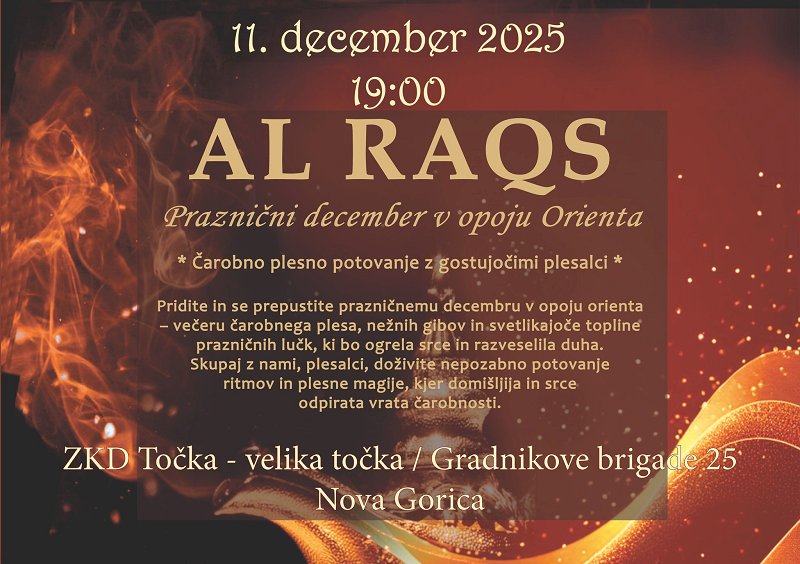 Čarobno plesno potovanje z gostujočimi plesalci. Pridite in se prepustite prazničnemu decembru v opoju orienta – večeru čarobnega plesa, nežnih gibov in svetlikajoče topline prazničnih lučk, ki bo ogrela srce in razveselila duha.