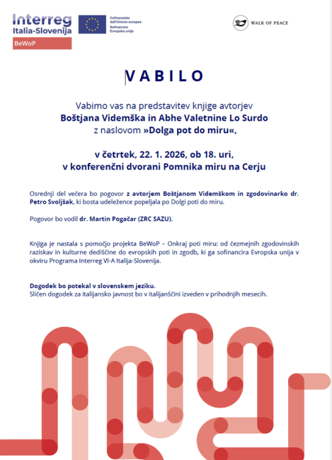 Osrednji del večera bo pogovor z avtorjem Boštjanom Videmškom in zgodovinarko dr. Petro Svoljšak, ki bosta udeležence popeljala po Dolgi poti do miru. Pogovor bo vodil dr. Martin Pogačar (ZRC SAZU).