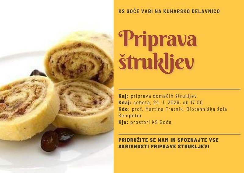 Krajevna skupnost Goče vabi na kuharsko delavnico Priprava štrukljev. Delavnica bo potekala v soboto, 24.1.2026 ob 17.00 v prostorih KS Goče. Delavnica bo vodila prof. Martina Fratnik, Biotehniška šola Šempeter.