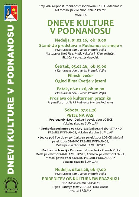 Vabljeni na dneve kulture v Podnanos, ki bodo potekali od nedelje, 1. 2. 2026 do nedelje, 8. 2. 2026. Program in ostale informacije so v priloženem vabilu.