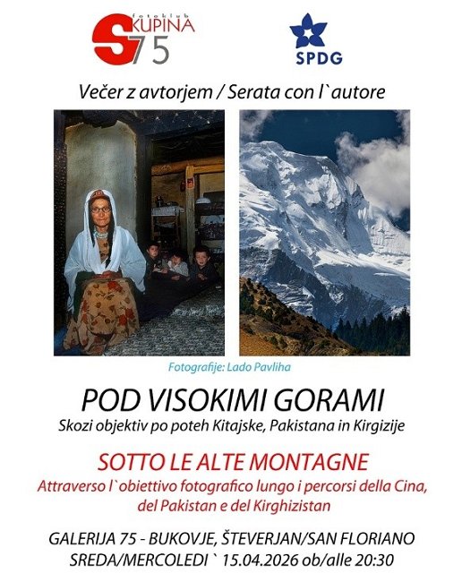 V kulturnem domu Ivana Humarja, v Števerjanu, bo potekalo videopredavanje in razstava fotografij Lada Pavlihe "Pod visokimi gorami," potopis z visokogorij Kitajske, Pakistana in Kirgizije. Lado Pavliha bo podal unikaten vpogled v spreminjanje pokrajine in življenja pod najvišjimi gorami sveta.