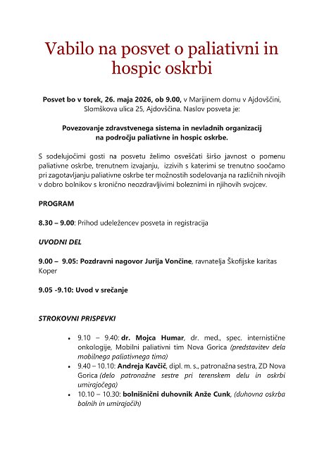 S sodelujočimi gosti na posvetu želimo osveščati širšo javnost o pomenu paliativne oskrbe, trenutnem izvajanju, izzivih, s katerimi se trenutno soočamo pri zagotavljanju paliativne oskrbe ter možnostih sodelovanja na različnih nivojih v dobro bolnikov s kronično neozdravljivimi boleznimi in njihovih svojcev.