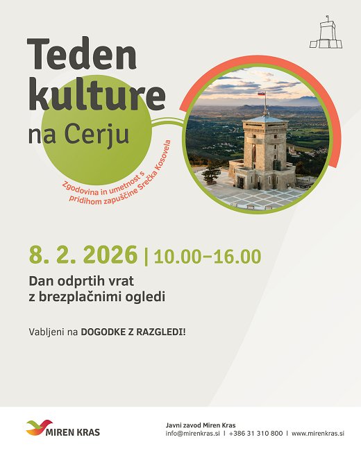 Nazaj na dogodke Kultura Teden kulture na Cerju: Dan odprtih vrat z brezplačnimi ogledi Pomnik miru in razgledni stolp Cerje 08.02.2026 10:00 - 16:00 | +386 31 310 800 | www.mirenkras.si Na slovenski kulturni praznik odpiramo vrata z brezplačnimi ogledi. Vstop prost.