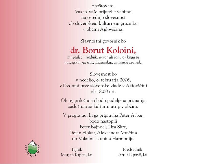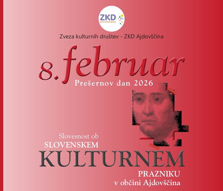 Zveza kulturnih društev - ZKD Ajdovščina vabi na osrednjo slovesnost ob slovenskem kulturnem prazniku v občini Ajdovščina. Slavnostni govornik bo dr. Borut Koloini, muzealec, urednik, avtor ali soavtor knjig in muzejskih razstav, muzejski svetnik. Ob tej priložnosti bodo podeljena priznanja zaslužnim za kulturni utrip v občini. V programu, ki ga oblikuje Peter Avbar, bodo nastopili Peter Bajnoci, Liza Skrt, Dejan Slokar, Aleksandra Vončina ter Vokalna skupina Harmonija.