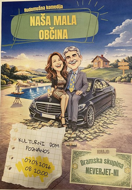 Turistično društvo Podnanos vabi na hudomušno komedijo, ki jo izvaja dramska skupina Neverjet-ni iz Bukovice, z naslovom NAŠA MALA OBČINA.
