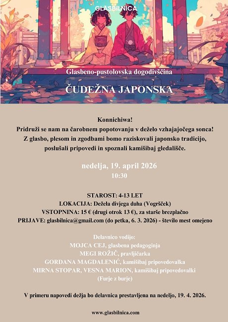 Z glasbo, plesom, zgodbami in kamišibaj gledališčem bomo skupaj odkrivali japonsko tradicijo in domišljijski svet. Pridružite se nam v Deželi divjega duha (Vogršček).