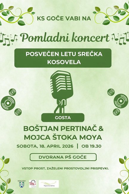 Krajevna skupnost Goče vabi na pomladni koncert posvečen letu Srečka Kosovela. Nastopala bosta Mojca Štoka Moya in Boštjan Pertinač. Koncert bo v soboto 18.4.2026 ob 19.30 v dvorani PŠ Goče. Vabljeni.