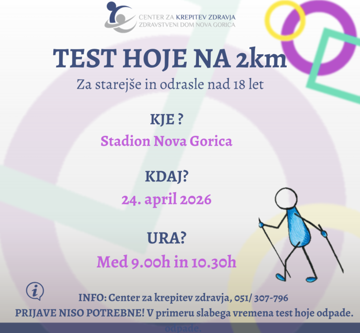 Na stadionu v Novi Gorici bo potekal test hoje na 2km za starejše in odrasle nad 18 let. Prijava ni potrebna. V primeru slabega vremena dogodek odpade.